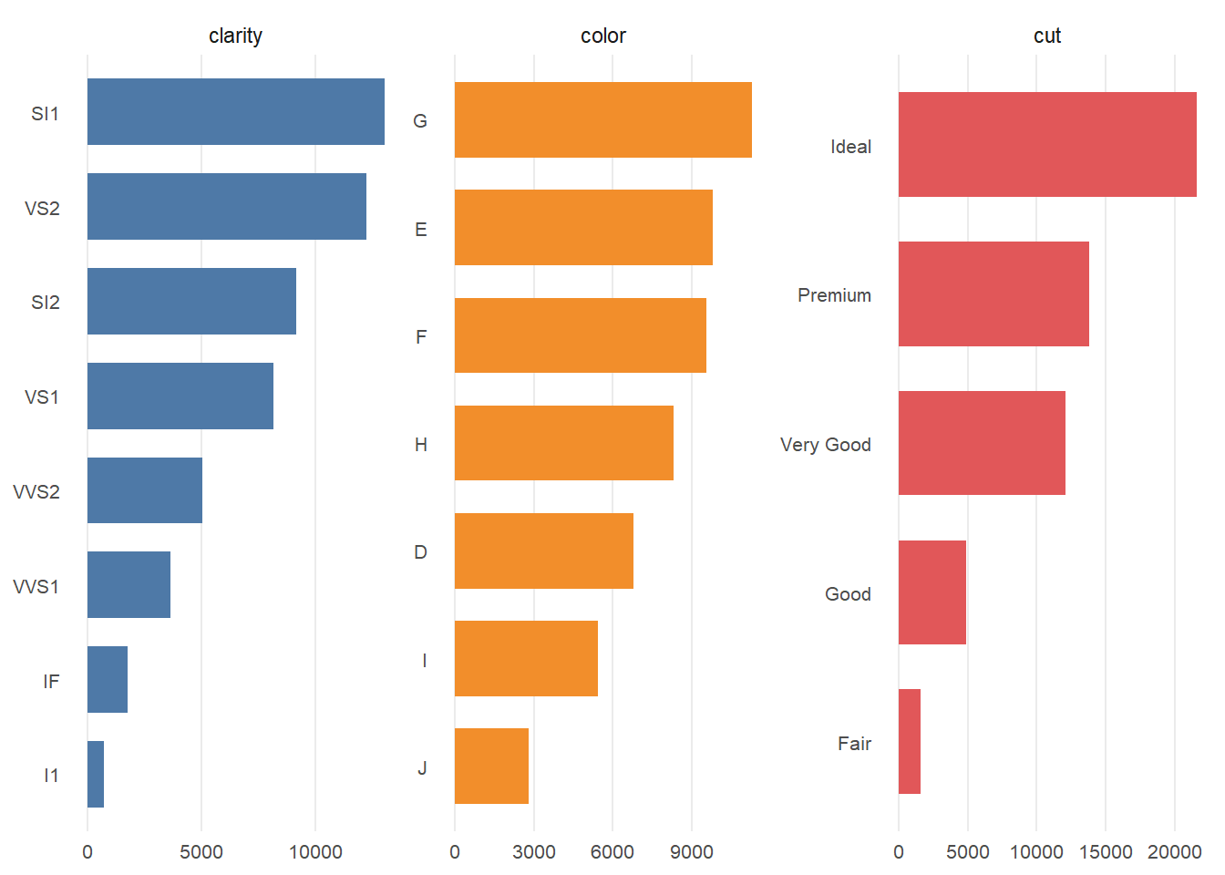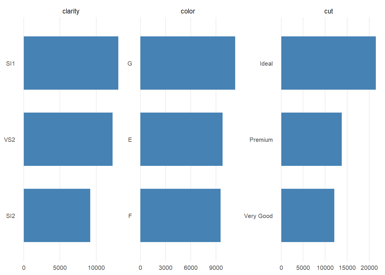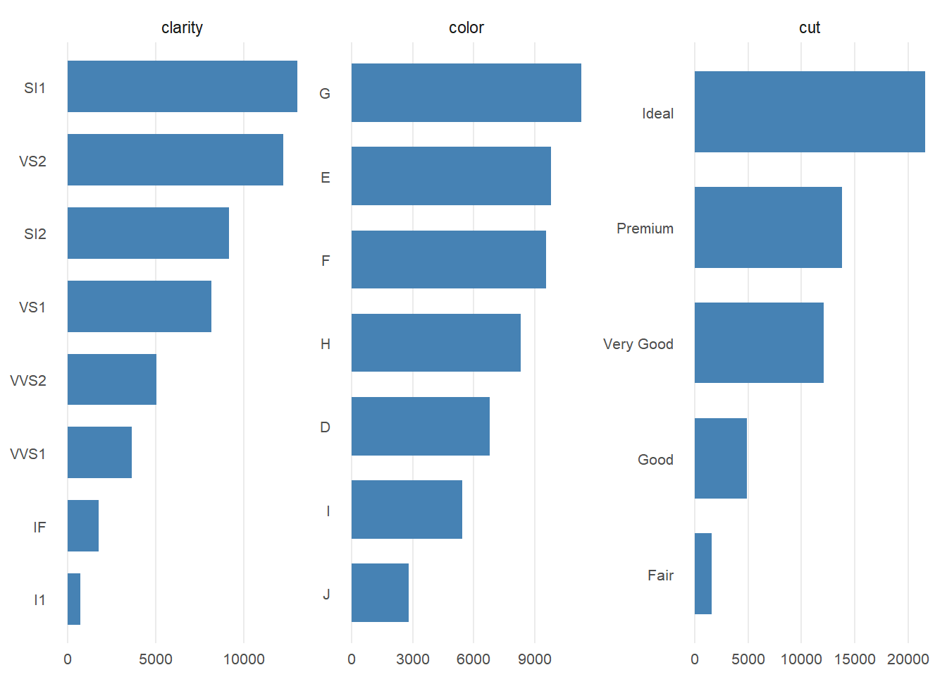 plotBar(ggplot2::diamonds, fill = "steelblue", top = 3)
