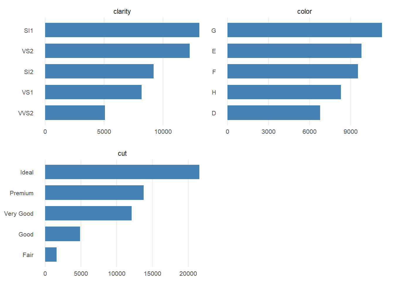 plotBar(ggplot2::diamonds, fill = "steelblue", top = 5, ncol = 2)
