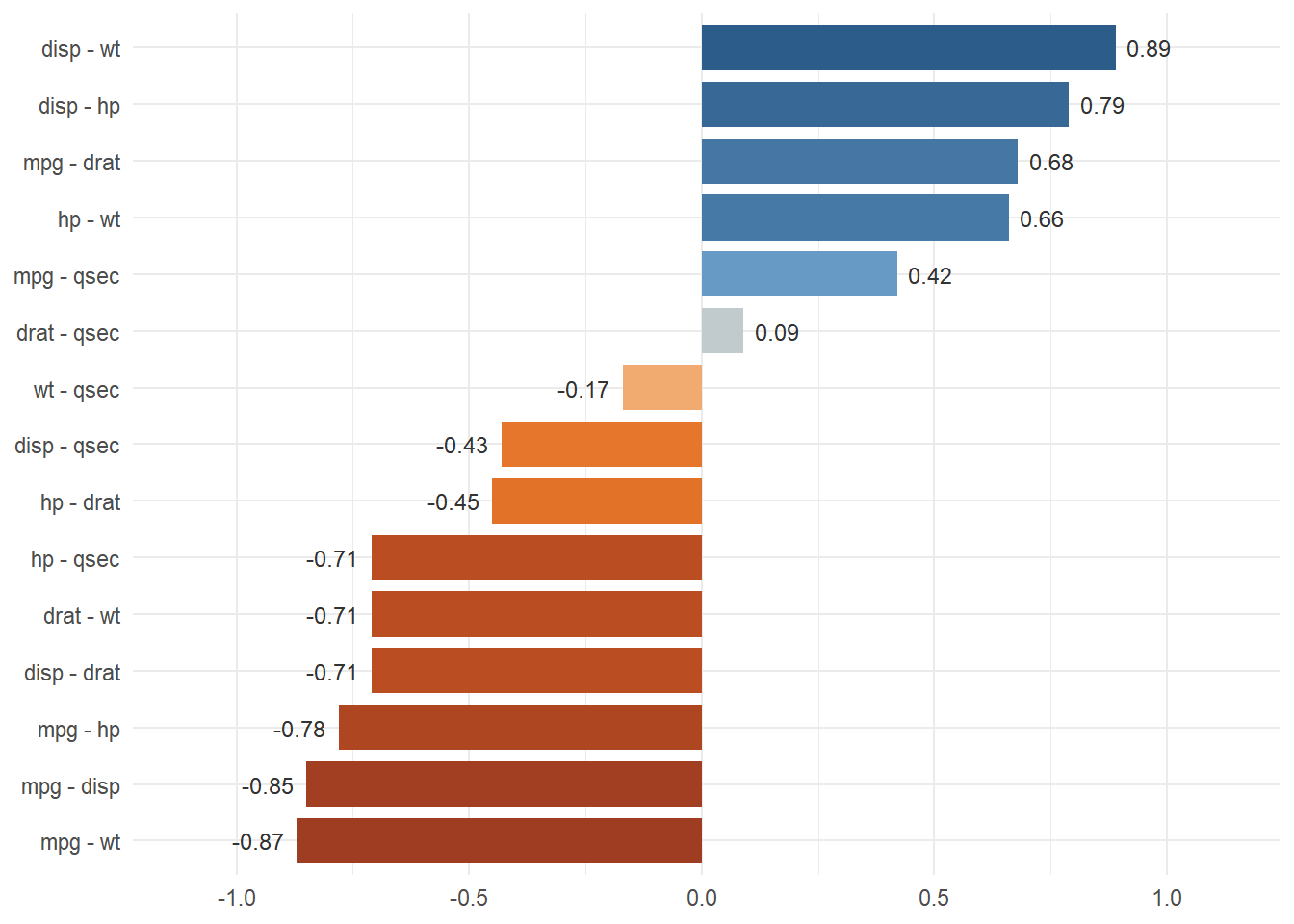 plotCorrelate(mtcars, palette_gradient = 'Orange-Blue Diverging')